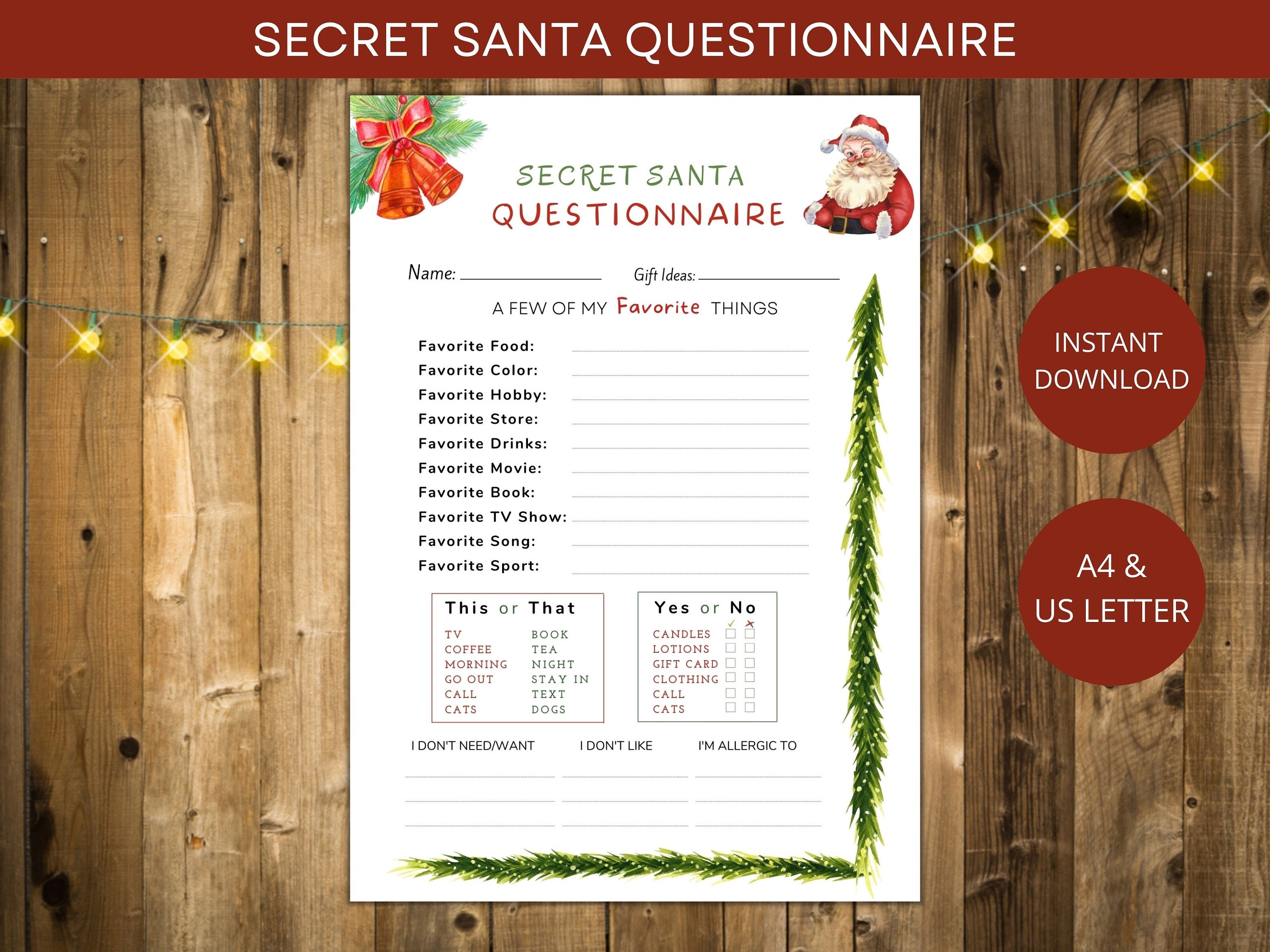 Printable Secret Santa Questionnaire Christmas Gift List Etsy